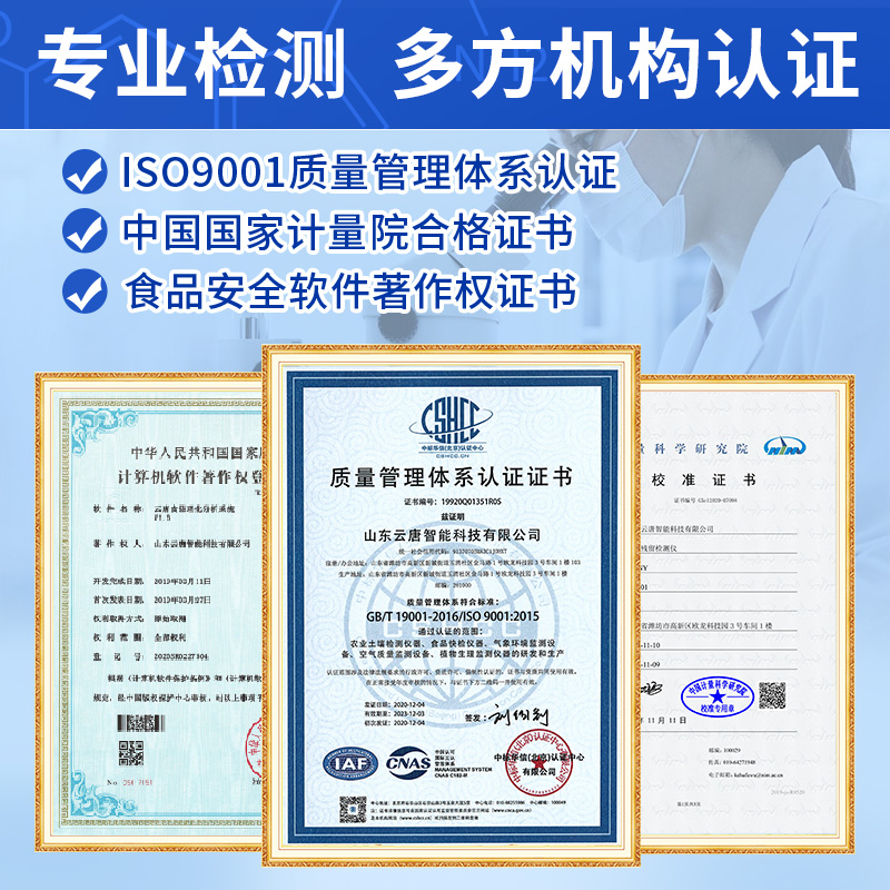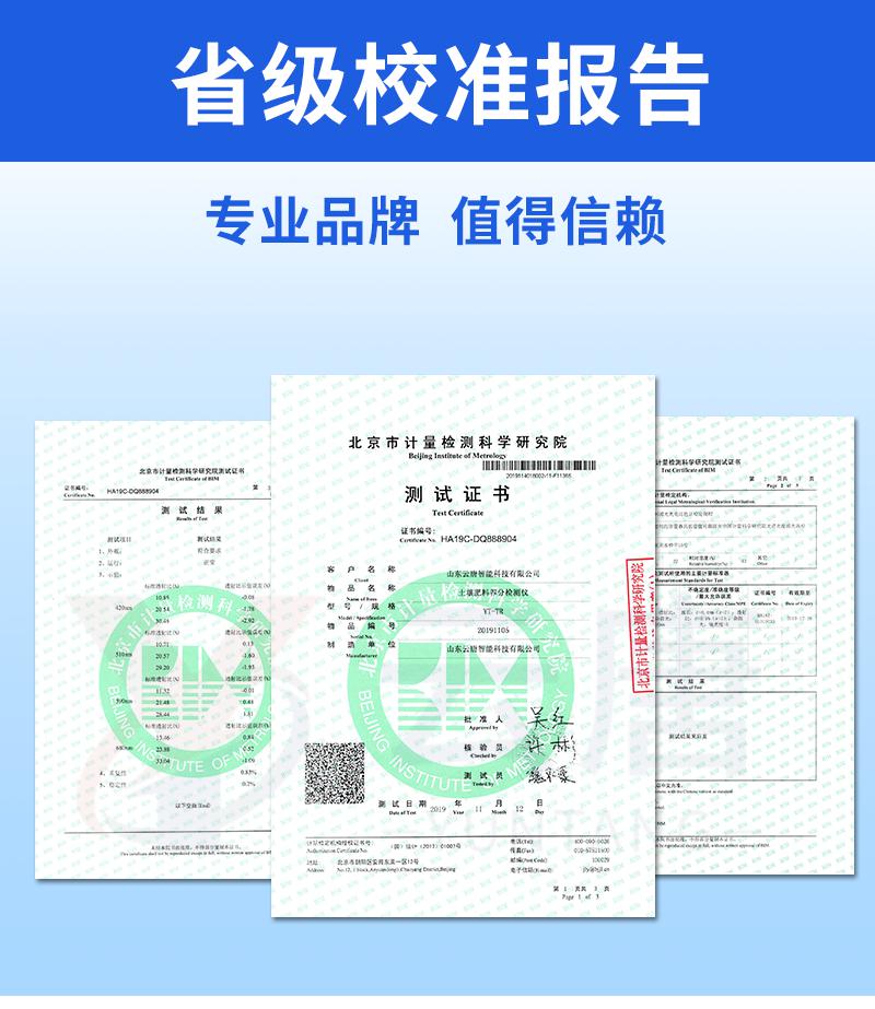 5、检测过程中内置校准功能,智能恒流稳压,光强自动校准,确保检测准确度,取得中国计量科学研究院的《校准证书》。